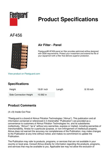 Fleetguard® AF456 panel air filter provides optimized airflow designed with OEM requirements. Protect your investment and extend the life of your equipment with a filter that delivers superior protection.Specification