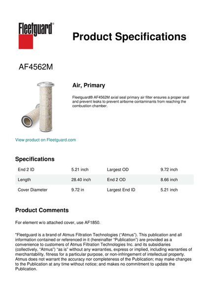 Fleetguard® AF4562M axial seal primary air filter ensures a proper seal and prevent leaks to prevent airborne contaminants from reaching the combustion chamber.