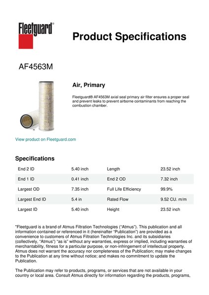 Fleetguard® AF4563M axial seal primary air filter ensures a proper seal and prevent leaks to prevent airborne contaminants from reaching the combustion chamber.