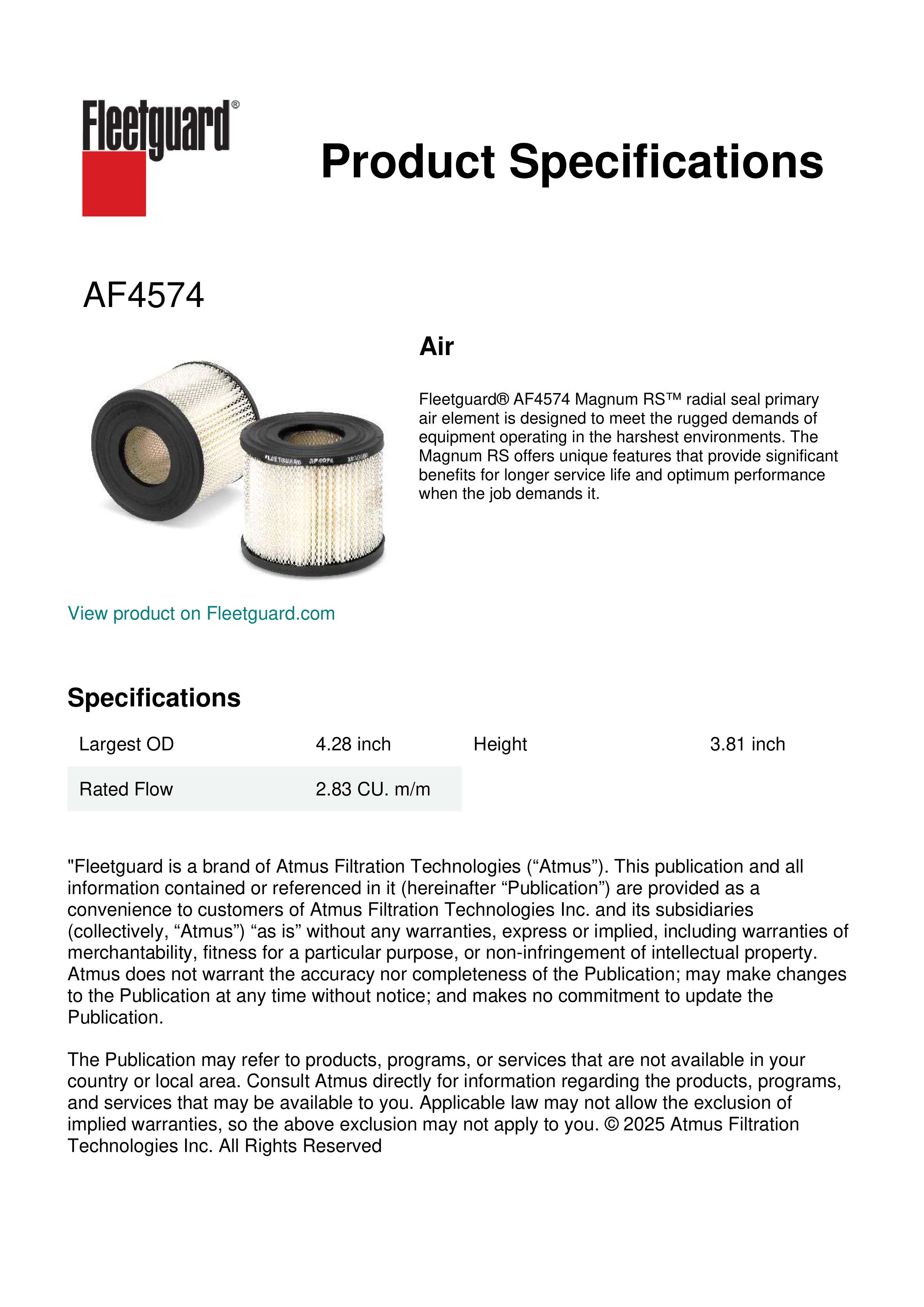 Fleetguard® AF4574 Magnum RS™ radial seal primary air element is designed to meet the rugged demands of equipment operating in the harshest environments. The Magnum RS offers unique features that provide significant benefits for longer service life and optimum performance when the job demands it.Specification