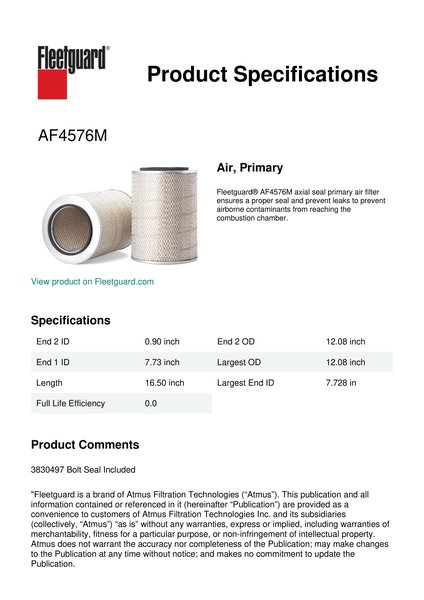 Fleetguard® AF4576M axial seal primary air filter ensures a proper seal and prevent leaks to prevent airborne contaminants from reaching the combustion chamber.