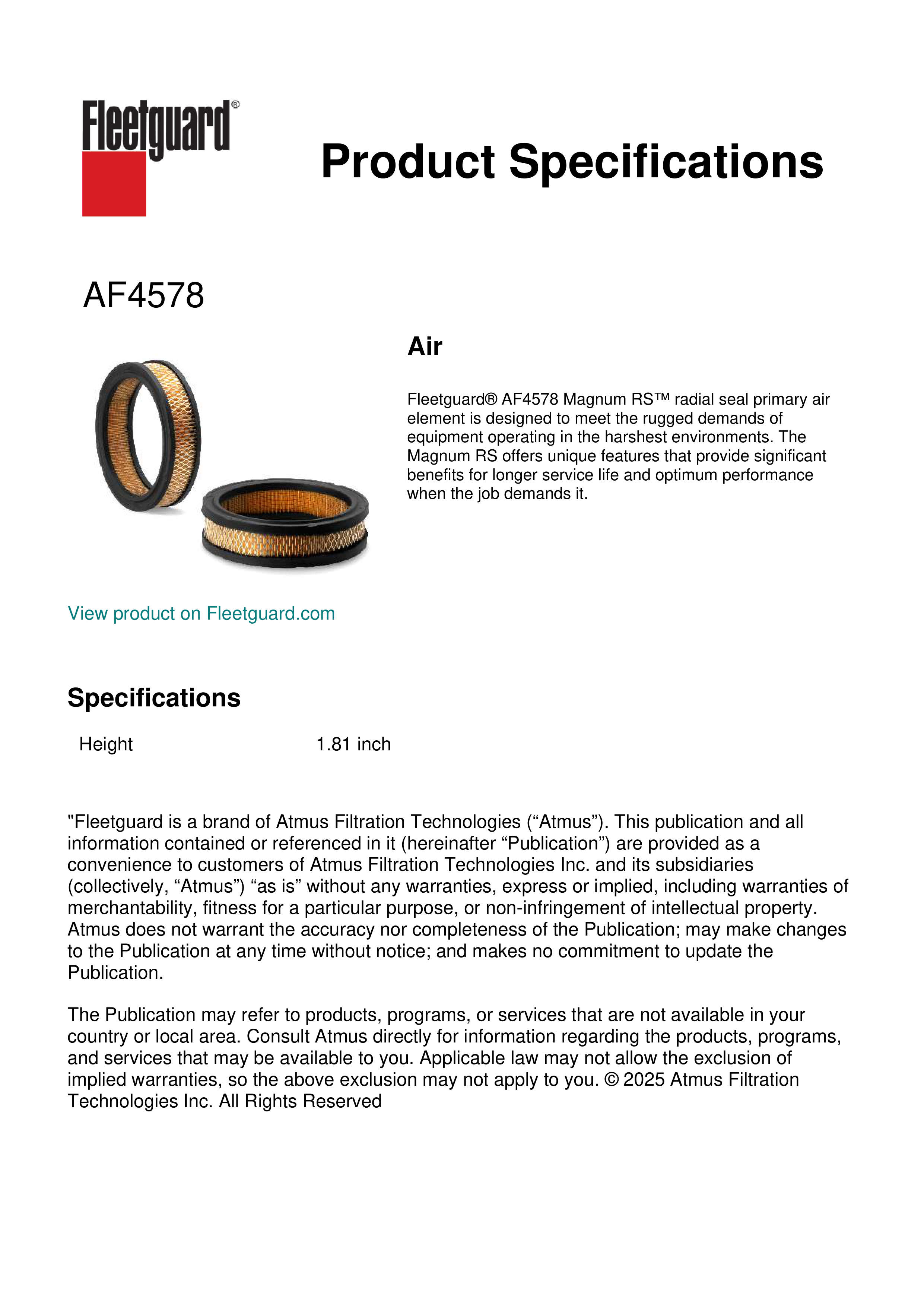 Fleetguard® AF4578 Magnum RS™ radial seal primary air element is designed to meet the rugged demands of equipment operating in the harshest environments. The Magnum RS offers unique features that provide significant benefits for longer service life and optimum performance when the job demands it.Specification