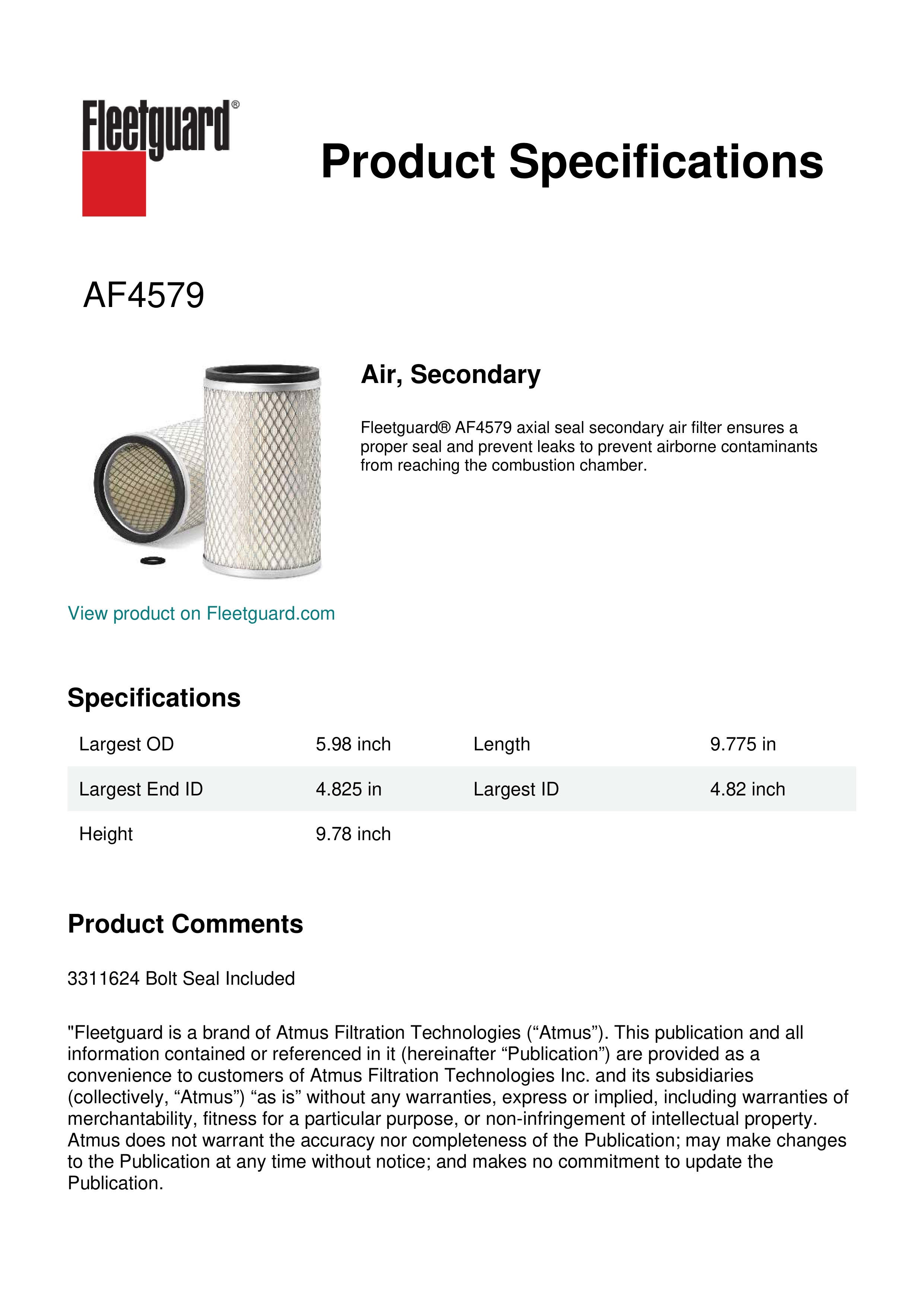 Fleetguard® AF4579 axial seal secondary air filter ensures a proper seal and prevent leaks to prevent airborne contaminants from reaching the combustion chamber.Specification