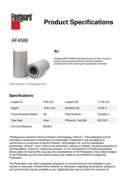 Fleetguard® AF4586 axial seal primary air filter ensures a proper seal and prevent leaks to prevent airborne contaminants from reaching the combustion chamber.