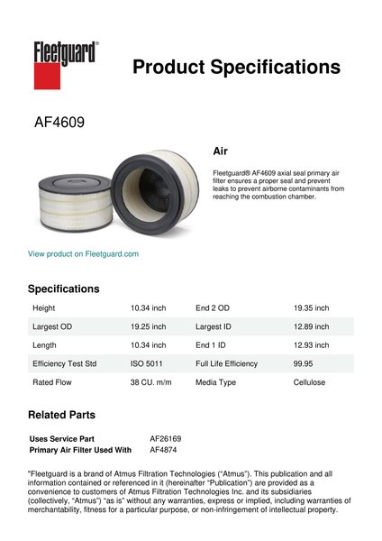 Fleetguard® AF4609 axial seal primary air filter ensures a proper seal and prevent leaks to prevent airborne contaminants from reaching the combustion chamber.