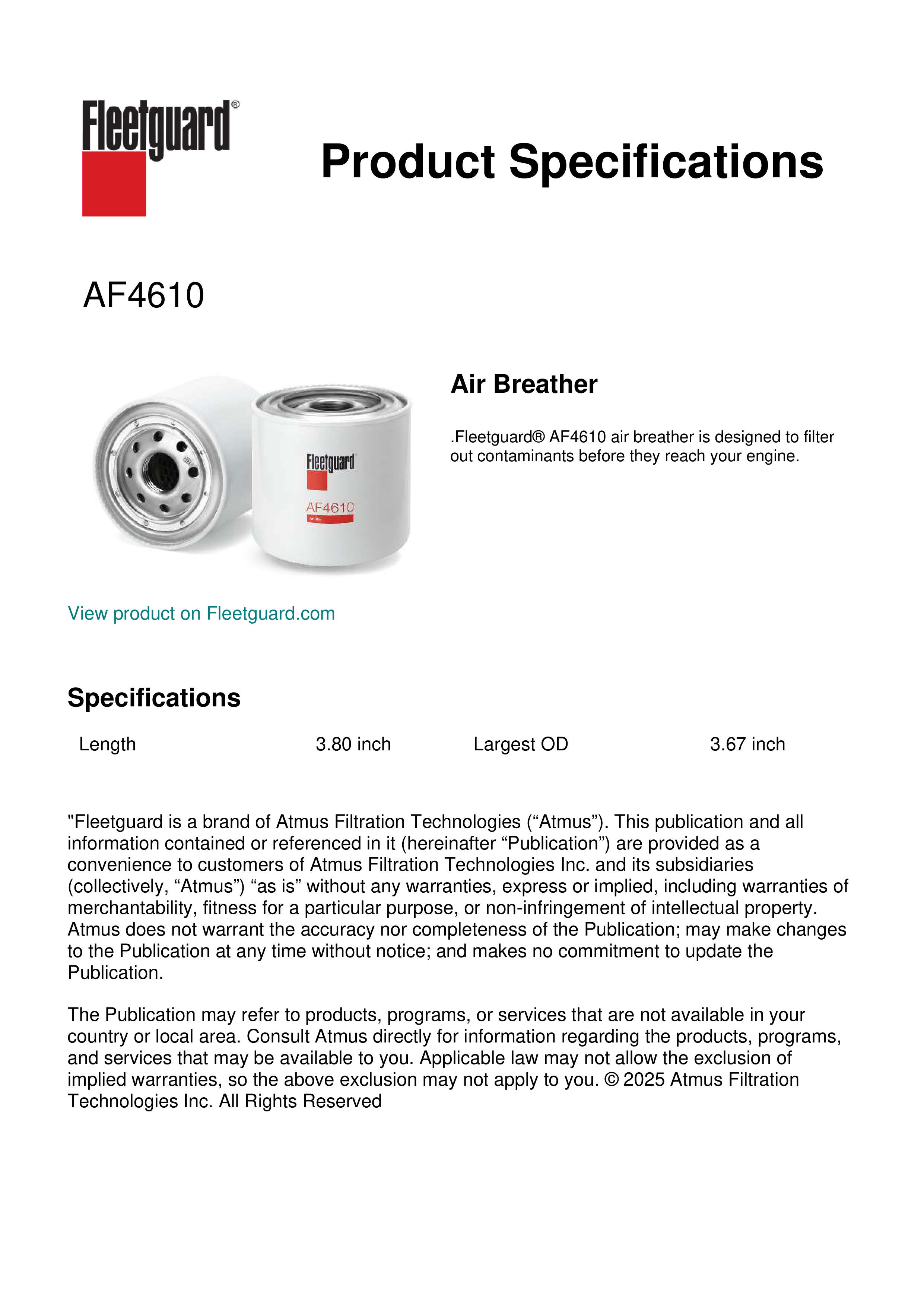 .Fleetguard® AF4610 air breather is designed to filter out contaminants before they reach your engine.Specification