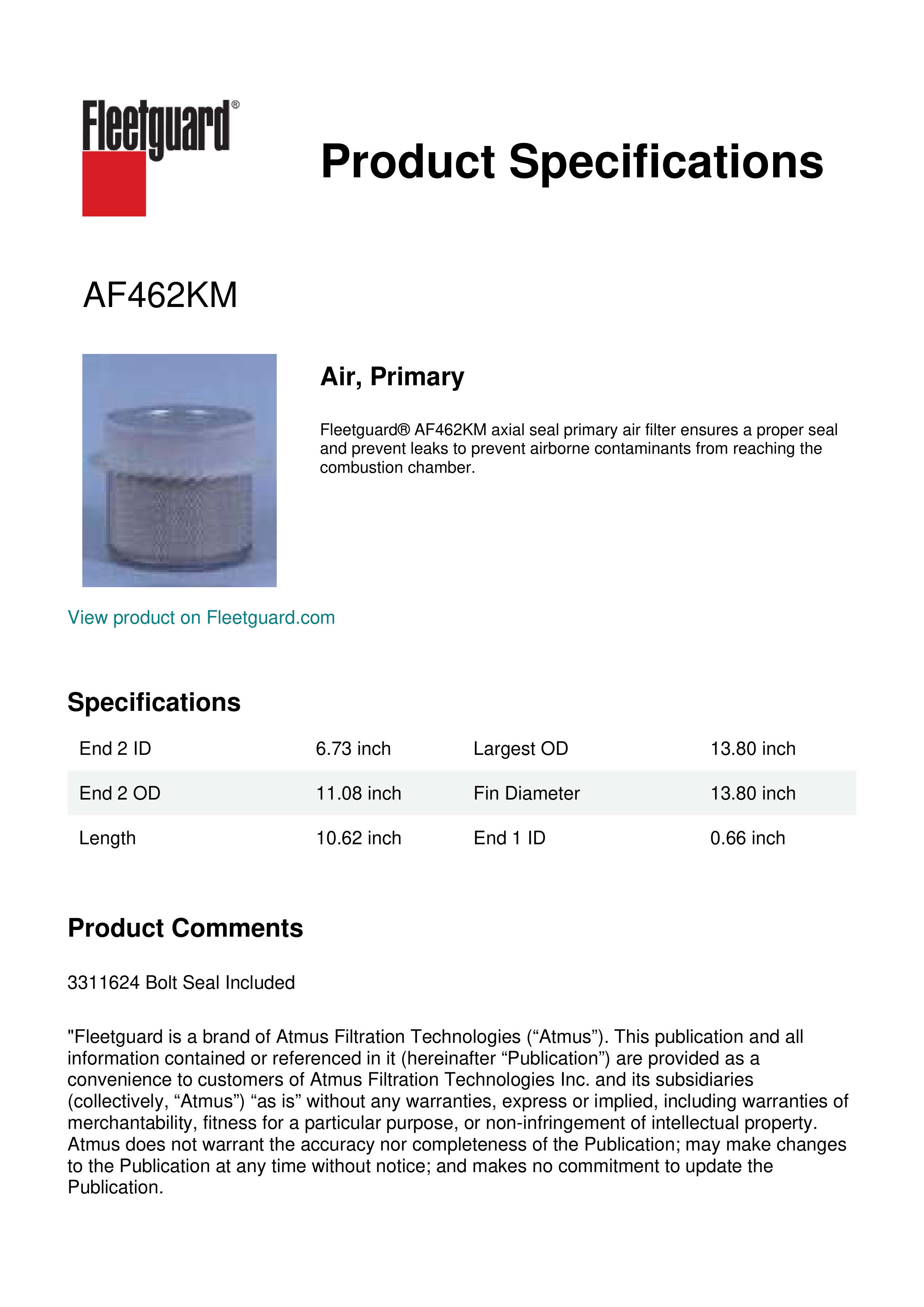 Fleetguard® AF462KM axial seal primary air filter ensures a proper seal and prevent leaks to prevent airborne contaminants from reaching the combustion chamber.Specification