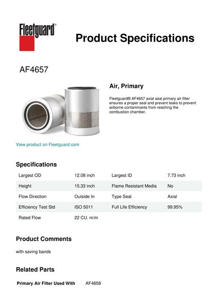 Fleetguard® AF4657 axial seal primary air filter ensures a proper seal and prevent leaks to prevent airborne contaminants from reaching the combustion chamber.