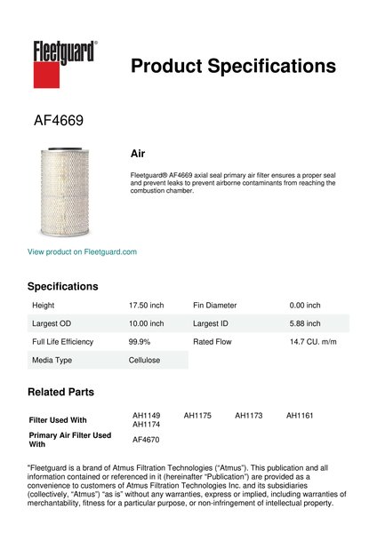 Fleetguard® AF4669 axial seal primary air filter ensures a proper seal and prevent leaks to prevent airborne contaminants from reaching the combustion chamber.