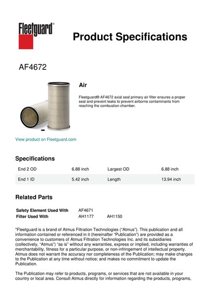 Fleetguard® AF4672 axial seal primary air filter ensures a proper seal and prevent leaks to prevent airborne contaminants from reaching the combustion chamber.