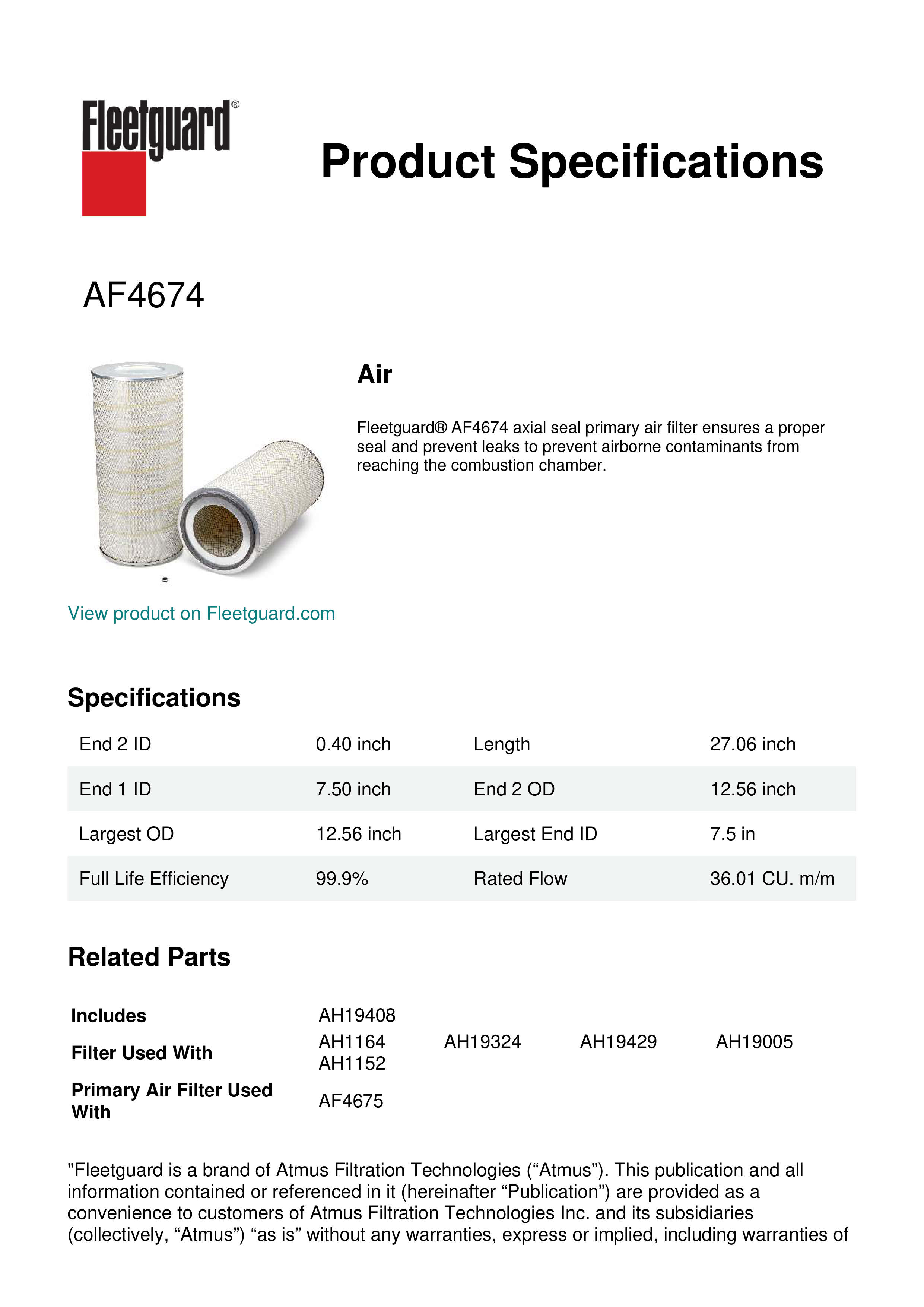 Fleetguard® AF4674 axial seal primary air filter ensures a proper seal and prevent leaks to prevent airborne contaminants from reaching the combustion chamber.