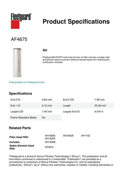 Fleetguard® AF4675 axial seal primary air filter ensures a proper seal and prevent leaks to prevent airborne contaminants from reaching the combustion chamber.
