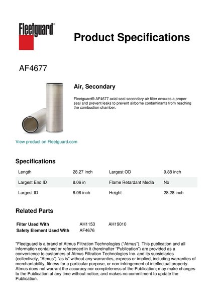 Fleetguard® AF4677 axial seal secondary air filter ensures a proper seal and prevent leaks to prevent airborne contaminants from reaching the combustion chamber.Specification