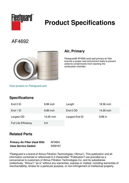 Fleetguard® AF4692 axial seal primary air filter ensures a proper seal and prevent leaks to prevent airborne contaminants from reaching the combustion chamber.