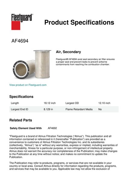 Fleetguard® AF4694 axial seal secondary air filter ensures a proper seal and prevent leaks to prevent airborne contaminants from reaching the combustion chamber.Specification