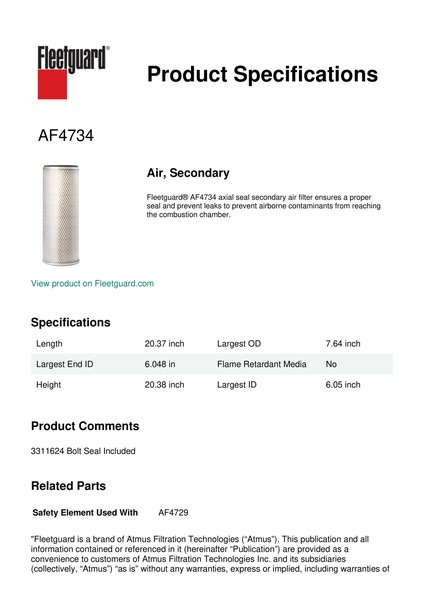 Fleetguard® AF4734 axial seal secondary air filter ensures a proper seal and prevent leaks to prevent airborne contaminants from reaching the combustion chamber.Specification