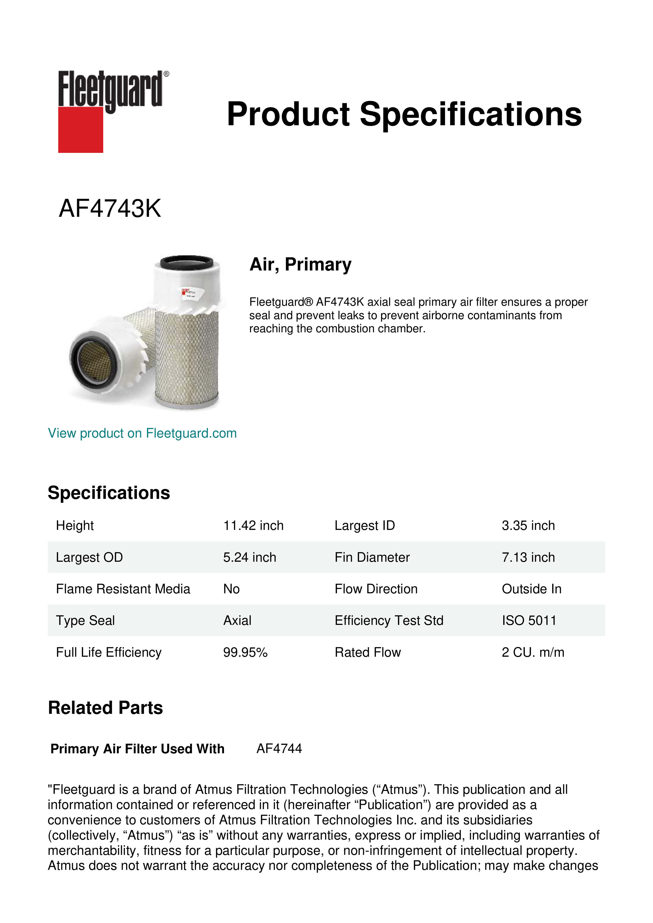 Fleetguard® AF4743K axial seal primary air filter ensures a proper seal and prevent leaks to prevent airborne contaminants from reaching the combustion chamber.