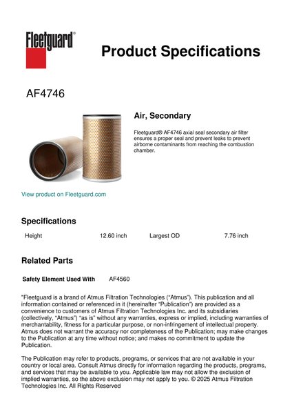 Fleetguard® AF4746 axial seal secondary air filter ensures a proper seal and prevent leaks to prevent airborne contaminants from reaching the combustion chamber.Specification