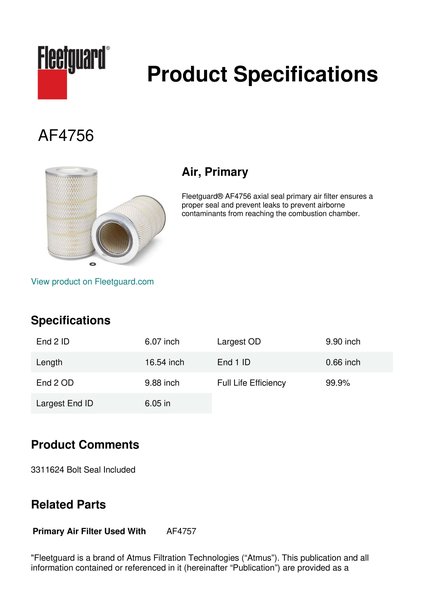 Fleetguard® AF4756 axial seal primary air filter ensures a proper seal and prevent leaks to prevent airborne contaminants from reaching the combustion chamber.