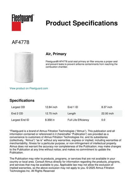 Fleetguard® AF4778 axial seal primary air filter ensures a proper seal and prevent leaks to prevent airborne contaminants from reaching the combustion chamber.