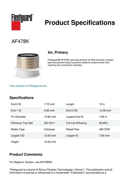 Fleetguard® AF478K axial seal primary air filter ensures a proper seal and prevent leaks to prevent airborne contaminants from reaching the combustion chamber.