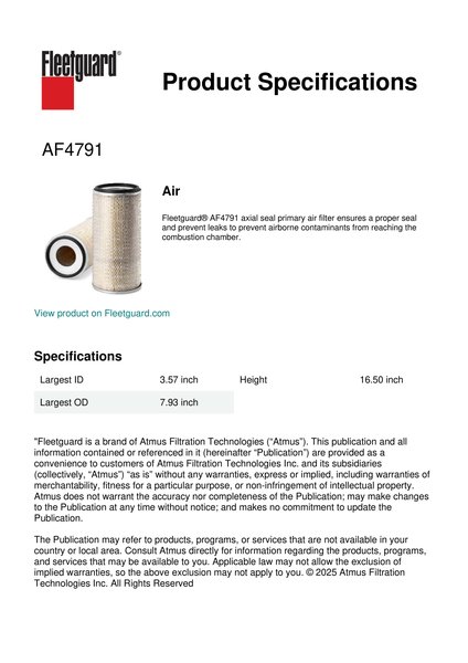 Fleetguard® AF4791 axial seal primary air filter ensures a proper seal and prevent leaks to prevent airborne contaminants from reaching the combustion chamber.