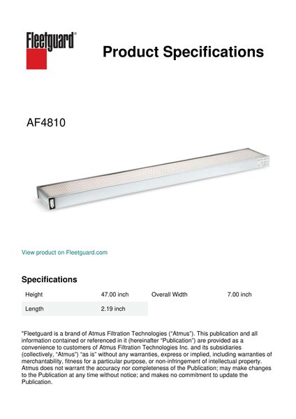 Fleetguard® AF4810 panel cabin air filter provides clean air in the cab which means a clean work environment. Breathing cleaner air can lead to longer and more productive working hours.Specification