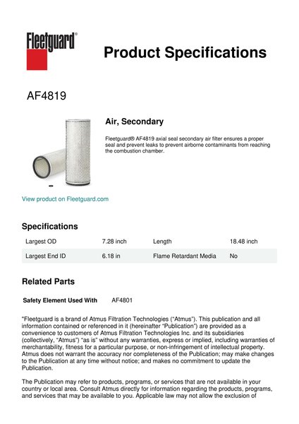 Fleetguard® AF4819 axial seal secondary air filter ensures a proper seal and prevent leaks to prevent airborne contaminants from reaching the combustion chamber.Specification