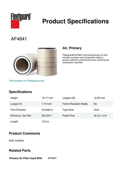 Fleetguard® AF4841 axial seal primary air filter ensures a proper seal and prevent leaks to prevent airborne contaminants from reaching the combustion chamber.