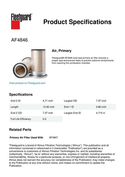 Fleetguard® AF4846 axial seal primary air filter ensures a proper seal and prevent leaks to prevent airborne contaminants from reaching the combustion chamber.
