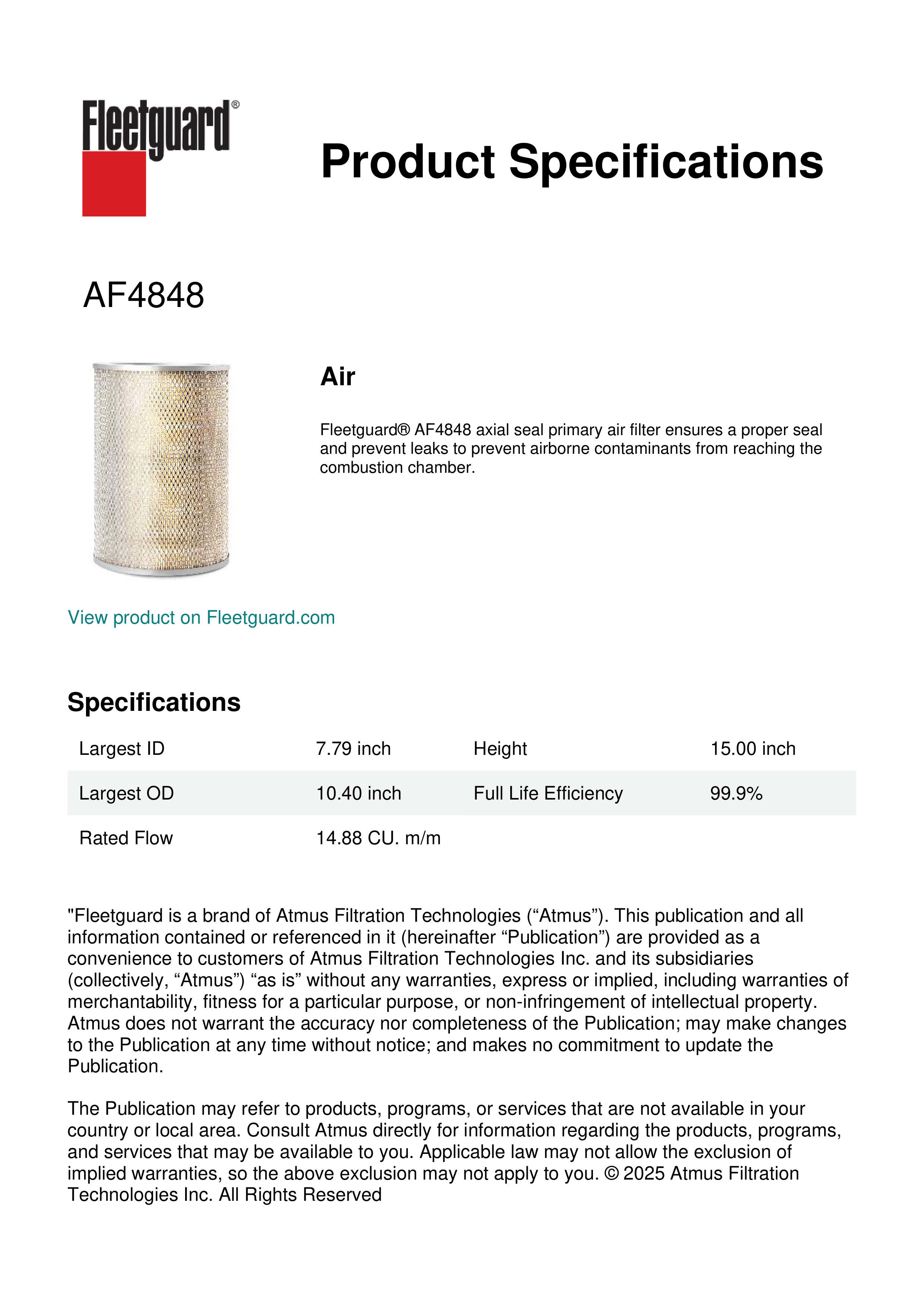 Fleetguard® AF4848 axial seal primary air filter ensures a proper seal and prevent leaks to prevent airborne contaminants from reaching the combustion chamber.
