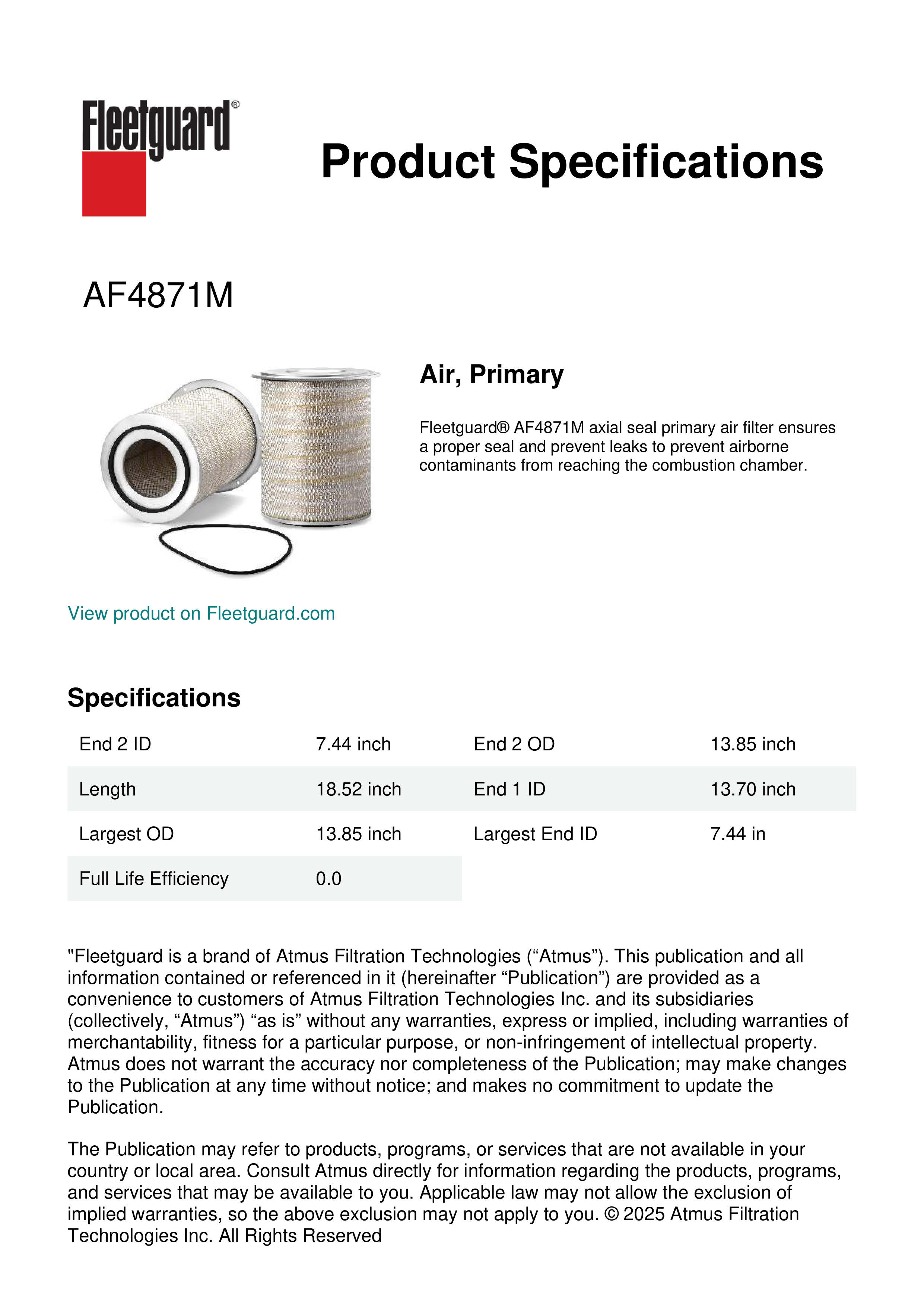 Fleetguard® AF4871M axial seal primary air filter ensures a proper seal and prevent leaks to prevent airborne contaminants from reaching the combustion chamber.Specification