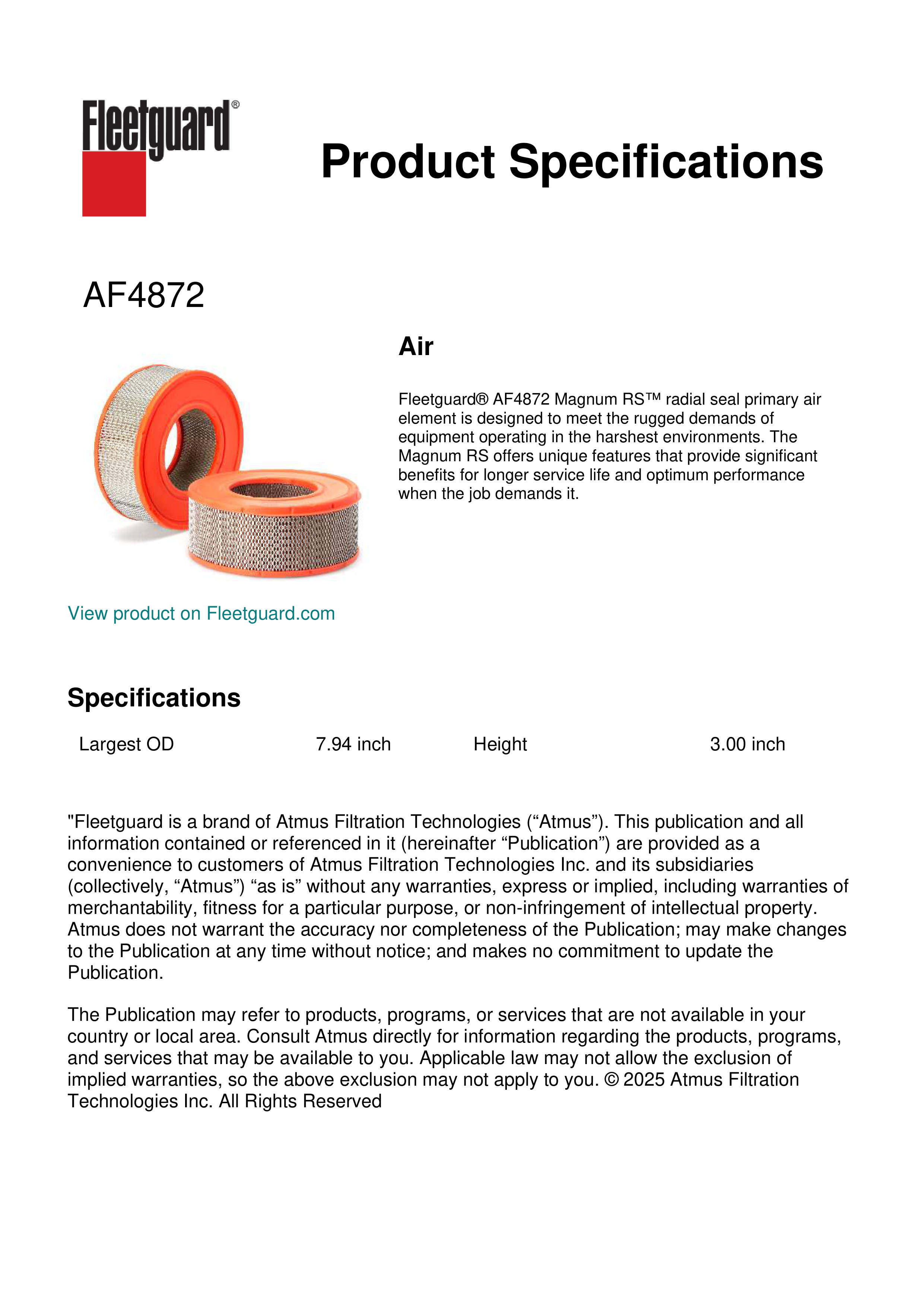 Fleetguard® AF4872 Magnum RS™ radial seal primary air element is designed to meet the rugged demands of equipment operating in the harshest environments. The Magnum RS offers unique features that provide significant benefits for longer service life and optimum performance when the job demands it.Specification