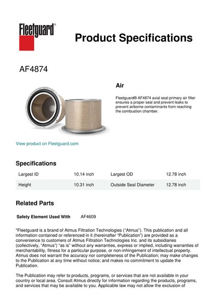 Fleetguard® AF4874 axial seal primary air filter ensures a proper seal and prevent leaks to prevent airborne contaminants from reaching the combustion chamber.