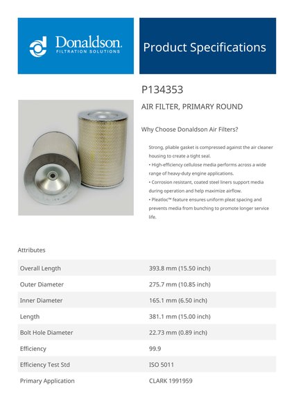 Donaldson P134353 Air Filter, Primary Round | Replaces the Fleetguard AF4903