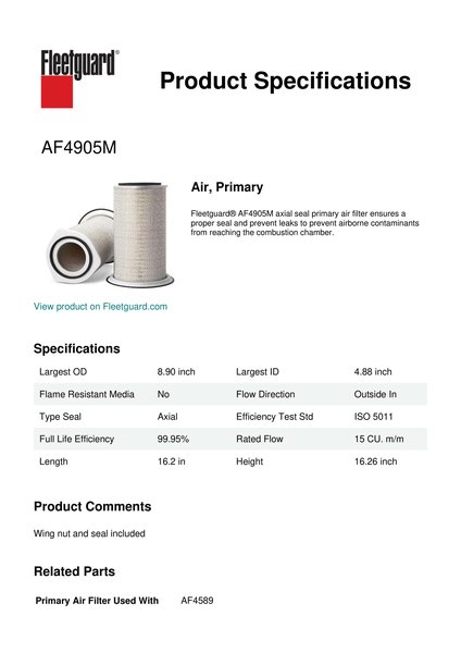 Fleetguard® AF4905M axial seal primary air filter ensures a proper seal and prevent leaks to prevent airborne contaminants from reaching the combustion chamber.