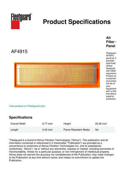 Fleetguard® AF4915 panel air filter provides optimized airflow designed with OEM requirements. Protect your investment and extend the life of your equipment with a filter that delivers superior protection.Specification