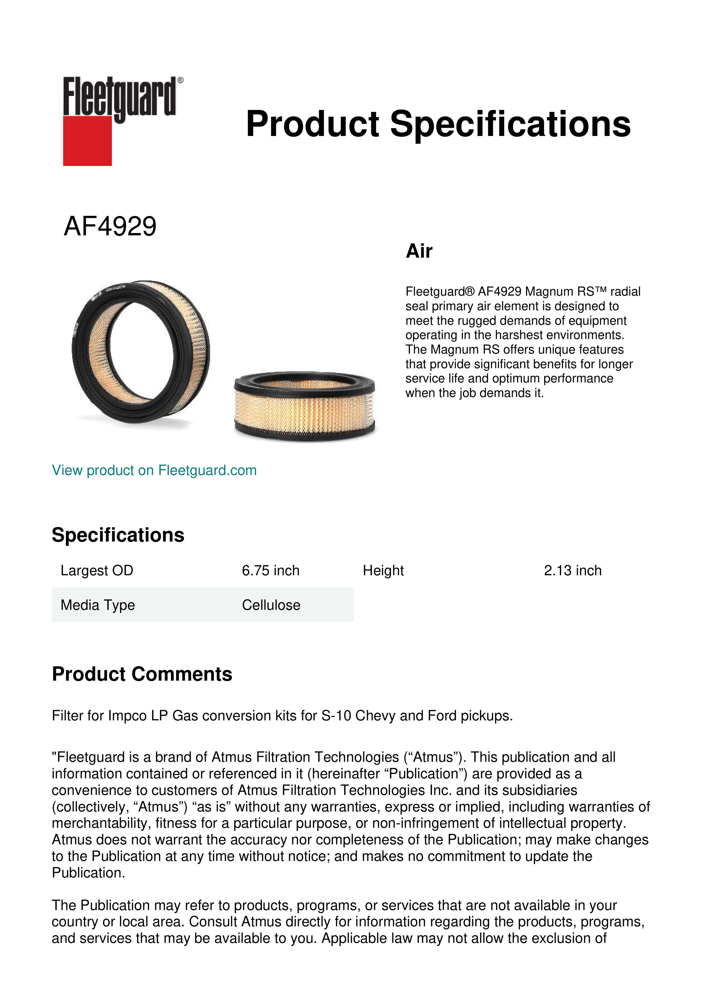 Fleetguard® AF4929 Magnum RS™ radial seal primary air element is designed to meet the rugged demands of equipment operating in the harshest environments. The Magnum RS offers unique features that provide significant benefits for longer service life and optimum performance when the job demands it.Specification