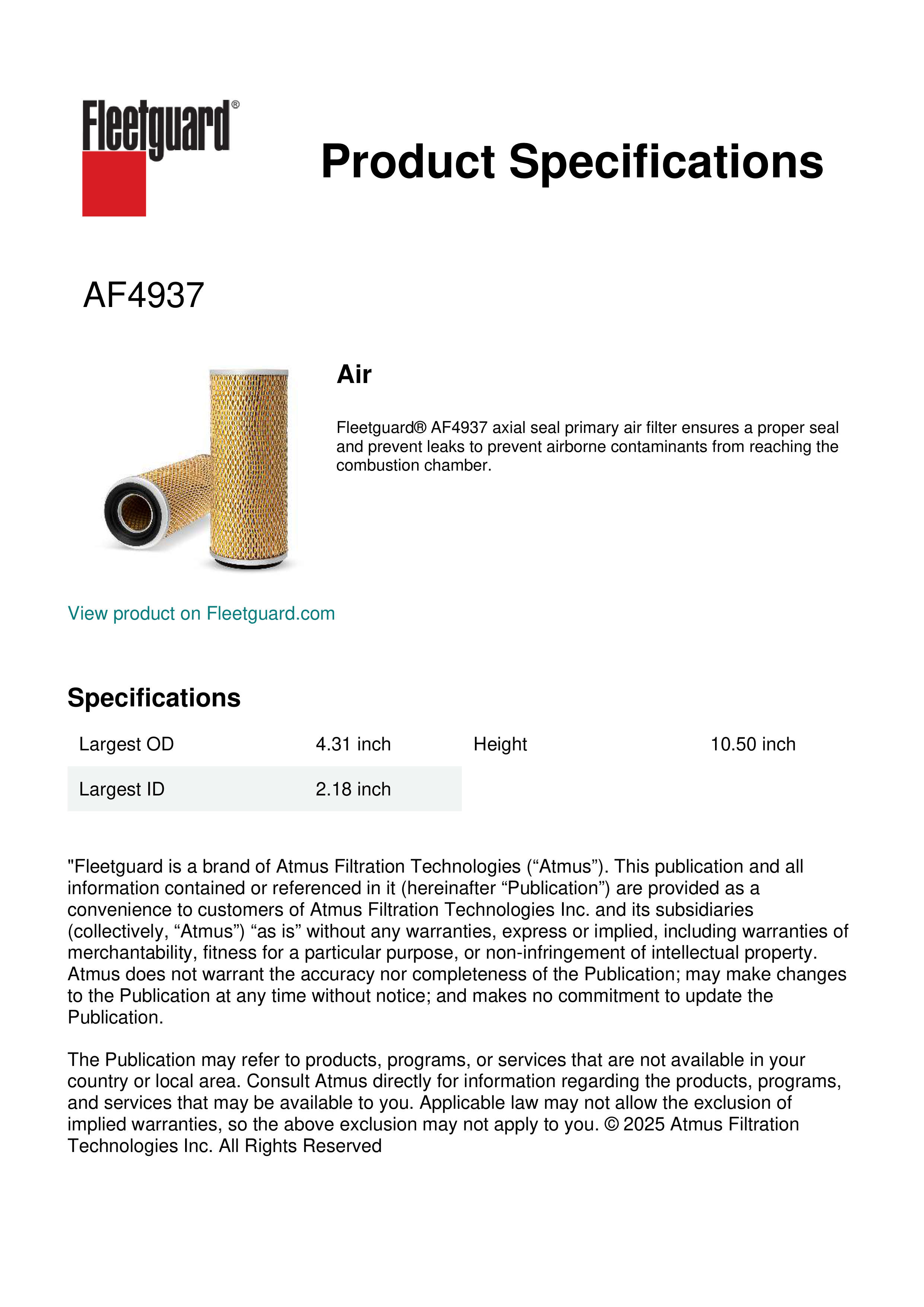 Fleetguard® AF4937 axial seal primary air filter ensures a proper seal and prevent leaks to prevent airborne contaminants from reaching the combustion chamber.