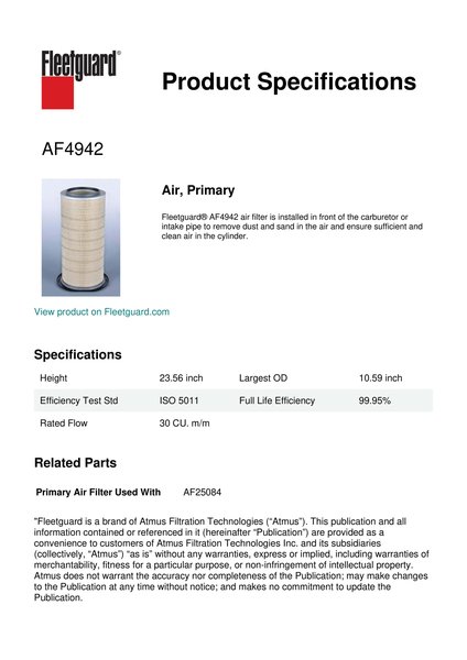Fleetguard® AF4942 air filter is installed in front of the carburetor or intake pipe to remove dust and sand in the air and ensure sufficient and clean air in the cylinder.Specification