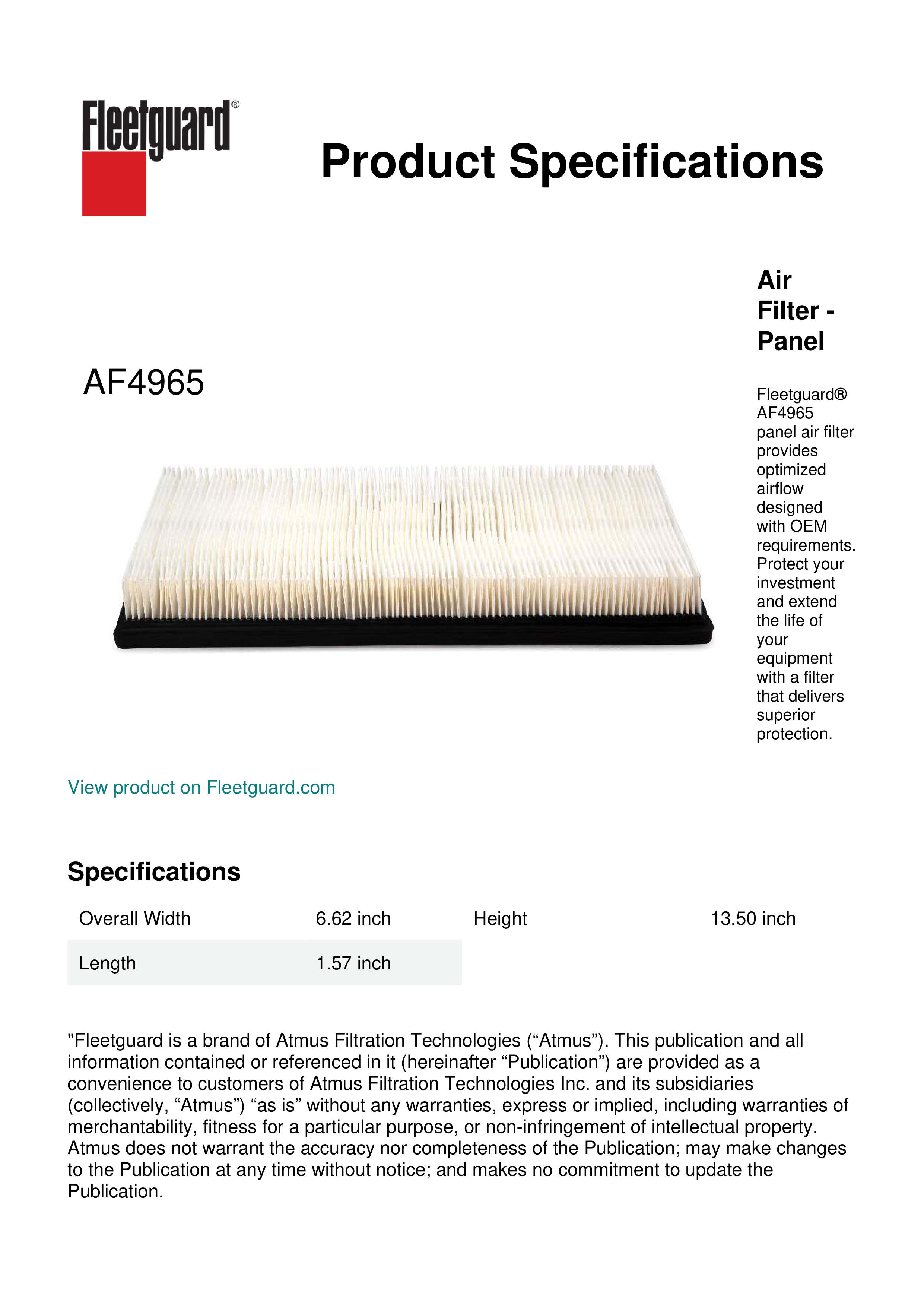Fleetguard® AF4965 panel air filter provides optimized airflow designed with OEM requirements. Protect your investment and extend the life of your equipment with a filter that delivers superior protection.Specification