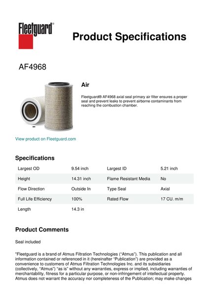 Fleetguard® AF4968 axial seal primary air filter ensures a proper seal and prevent leaks to prevent airborne contaminants from reaching the combustion chamber.