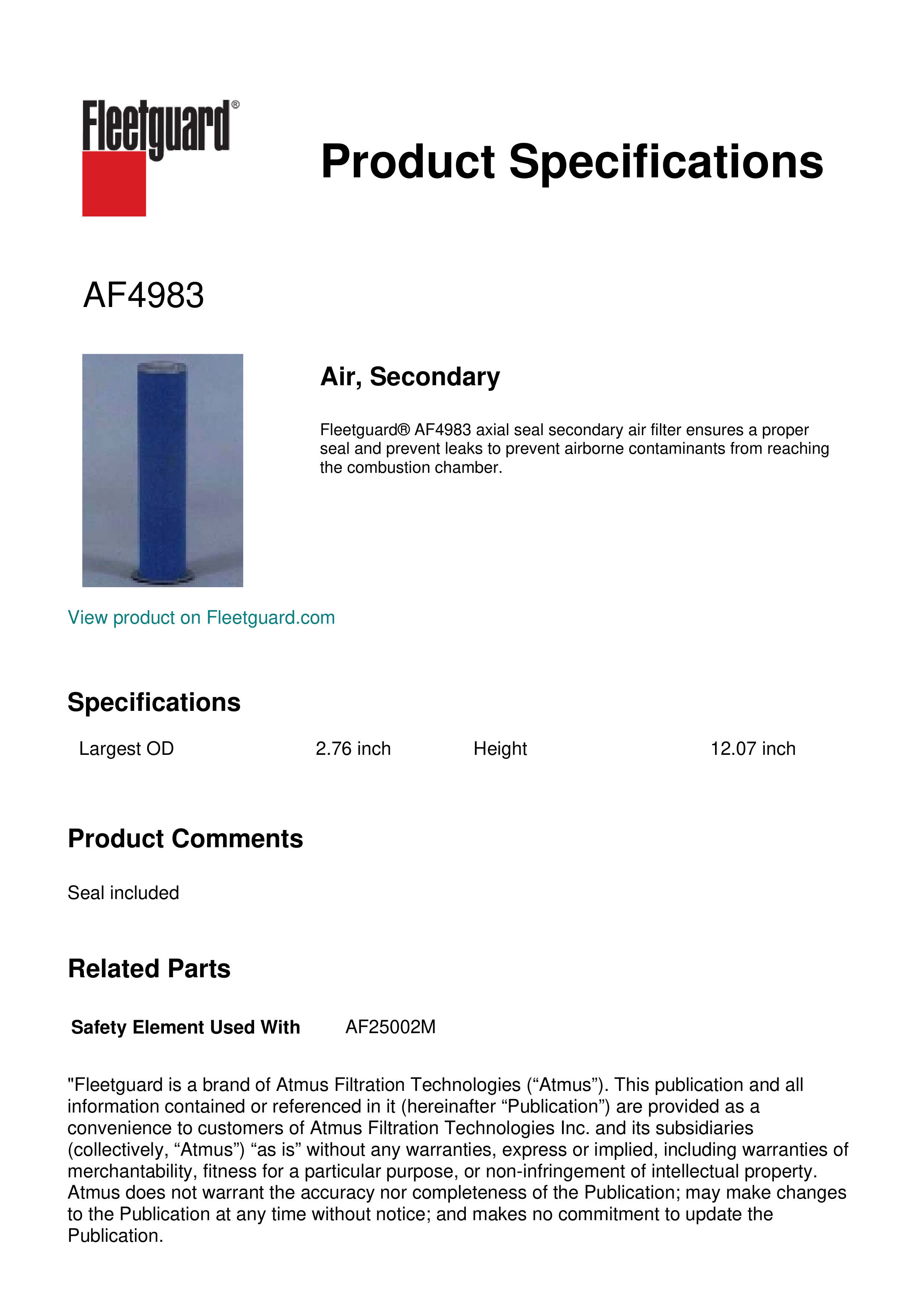 Fleetguard® AF4983 axial seal secondary air filter ensures a proper seal and prevent leaks to prevent airborne contaminants from reaching the combustion chamber.Specification