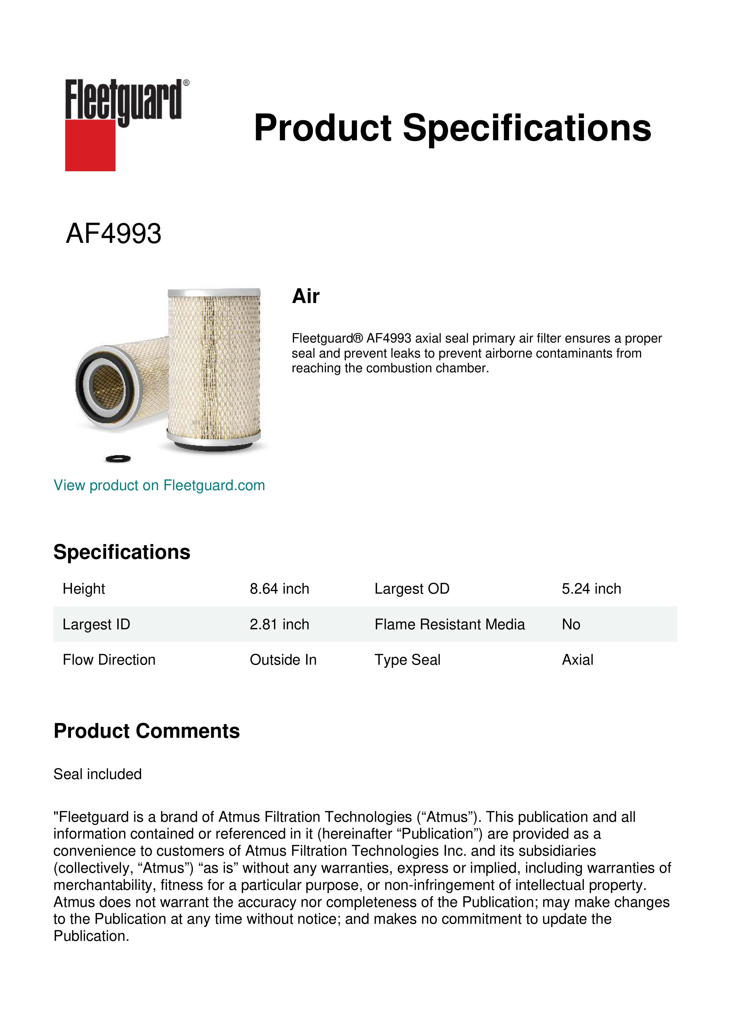 Fleetguard® AF4993 axial seal primary air filter ensures a proper seal and prevent leaks to prevent airborne contaminants from reaching the combustion chamber.
