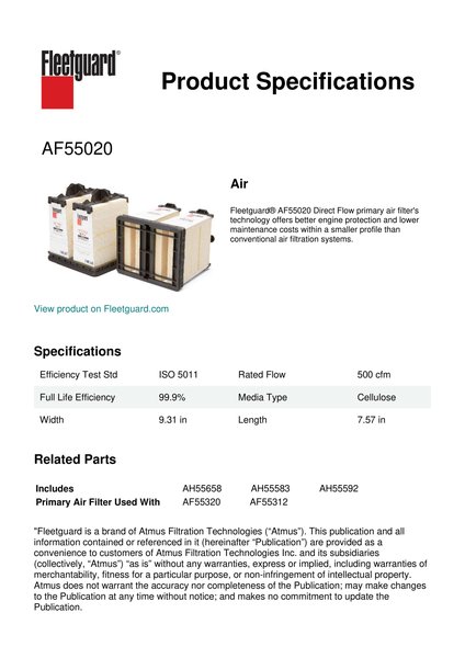 Fleetguard® AF55020 Direct Flow primary air filter's technology offers better engine protection and lower maintenance costs within a smaller profile than conventional air filtration systems.Specification