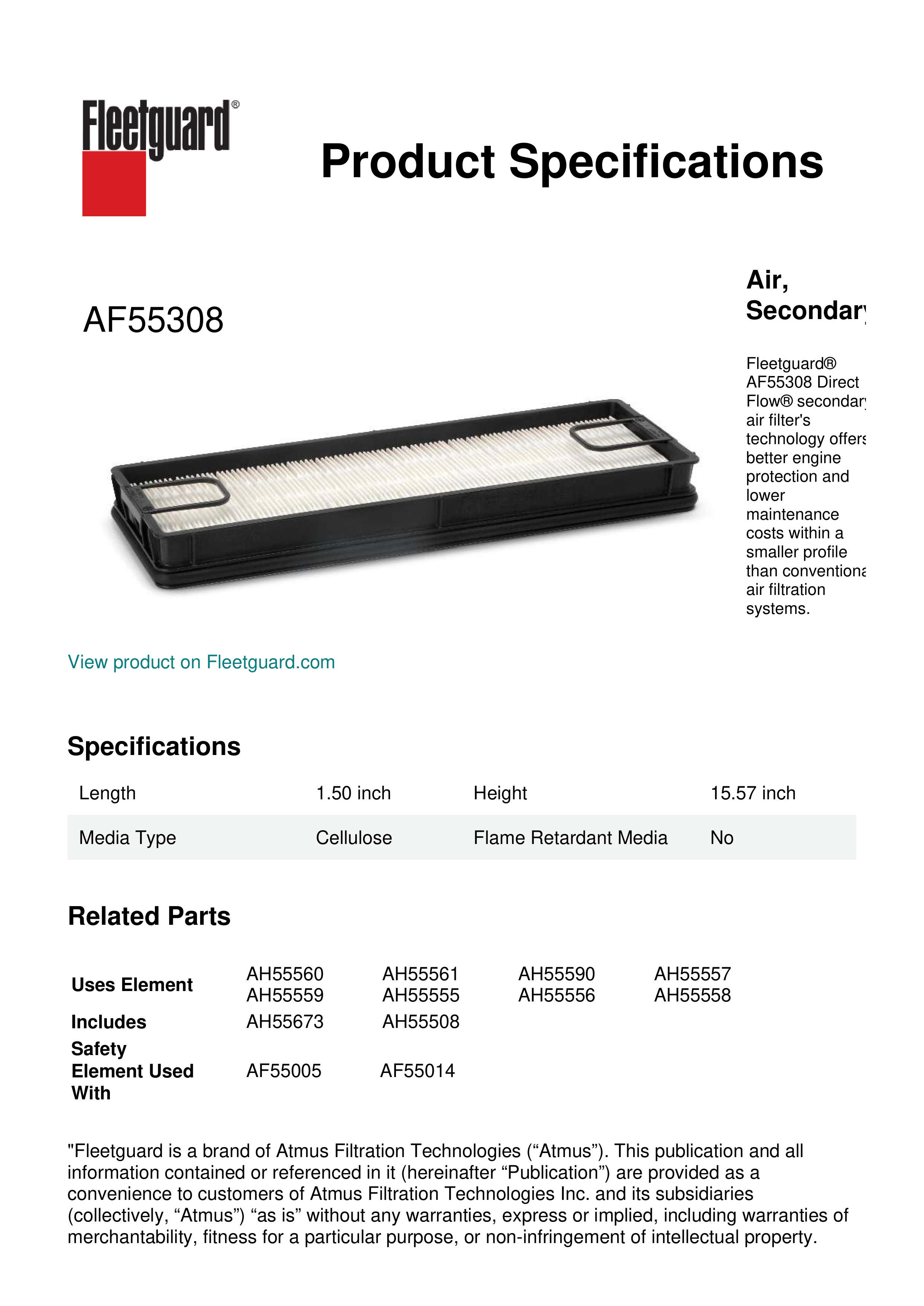 Fleetguard® AF55308 Direct Flow® secondary air filter's technology offers better engine protection and lower maintenance costs within a smaller profile than conventional air filtration systems.Specification