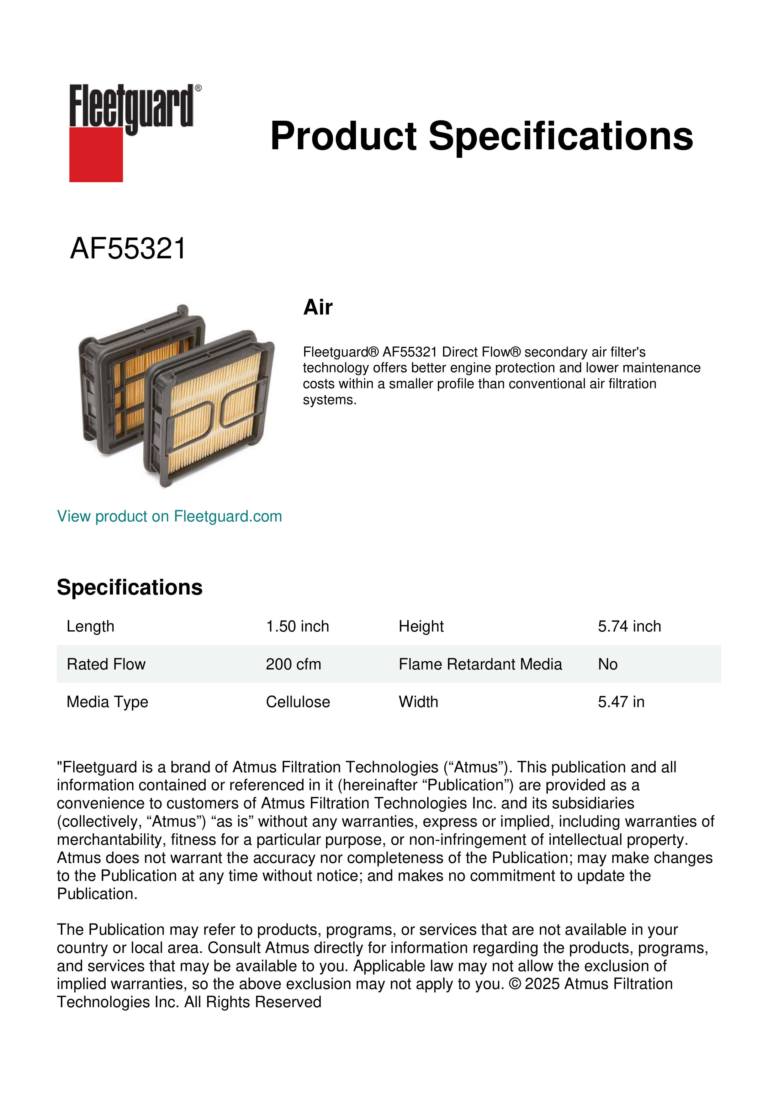 Fleetguard® AF55321 Direct Flow® secondary air filter's technology offers better engine protection and lower maintenance costs within a smaller profile than conventional air filtration systems.Specification