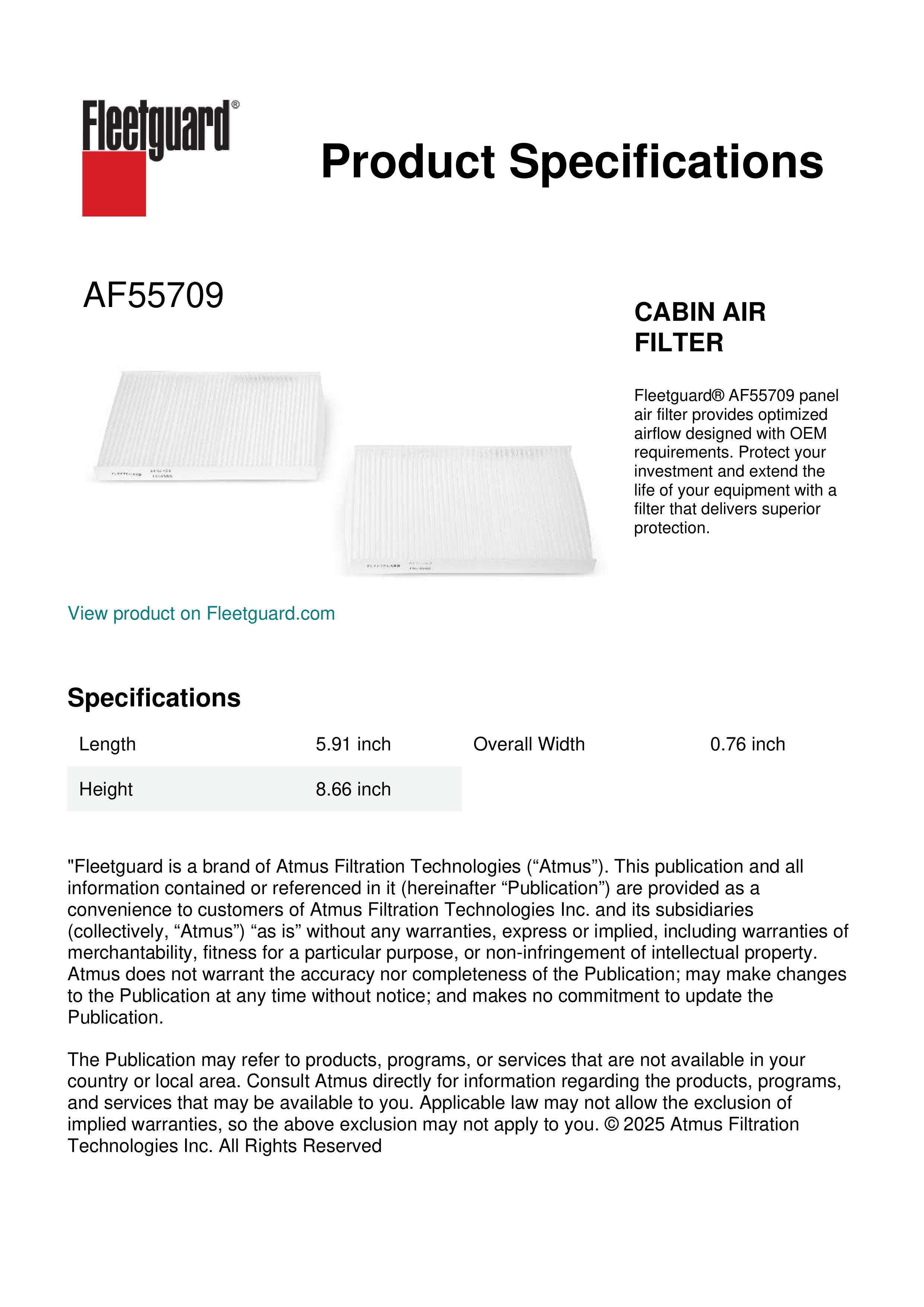 Fleetguard® AF55709 panel air filter provides optimized airflow designed with OEM requirements. Protect your investment and extend the life of your equipment with a filter that delivers superior protection.Specification