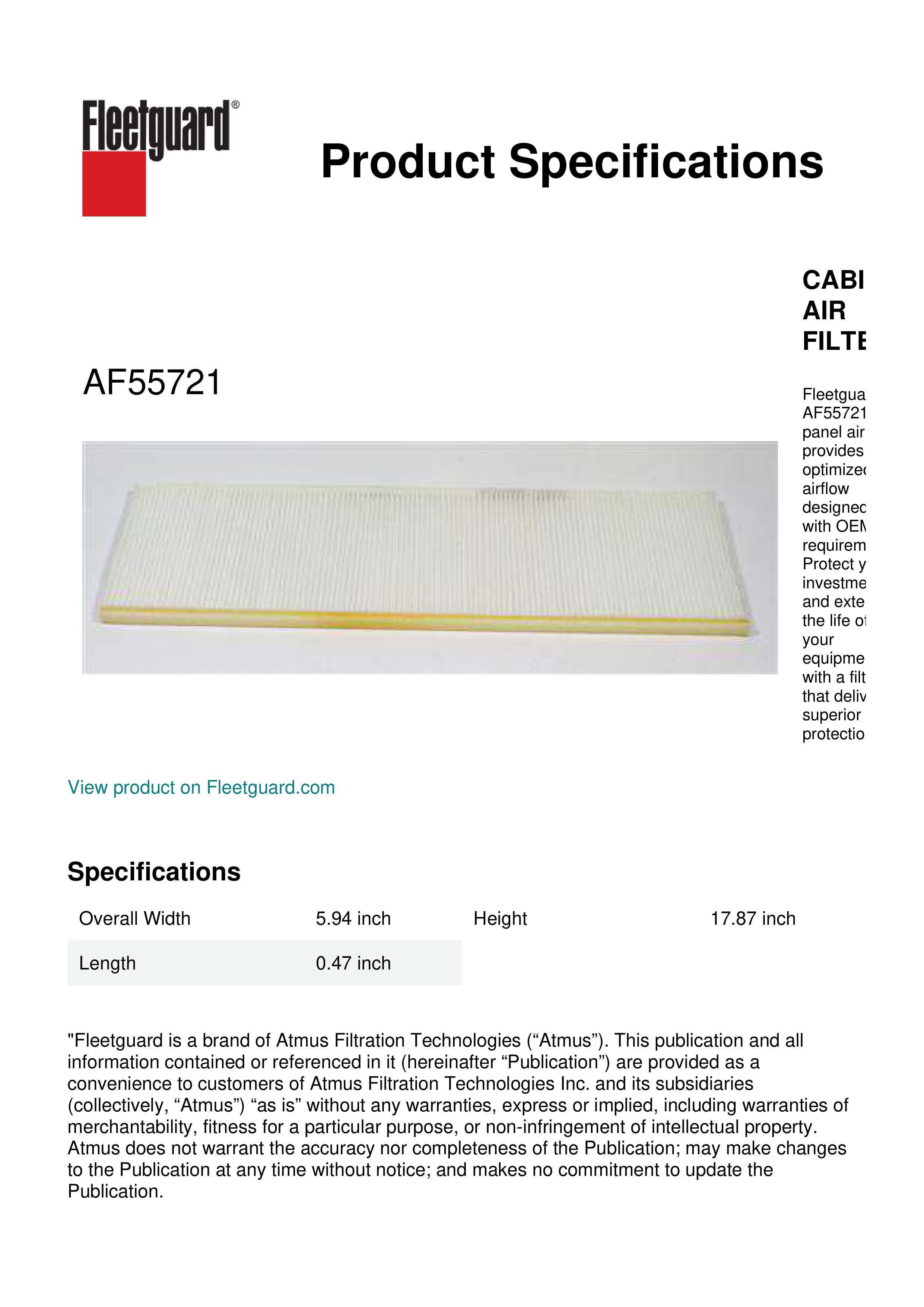Fleetguard® AF55721 panel air filter provides optimized airflow designed with OEM requirements. Protect your investment and extend the life of your equipment with a filter that delivers superior protection.Specification