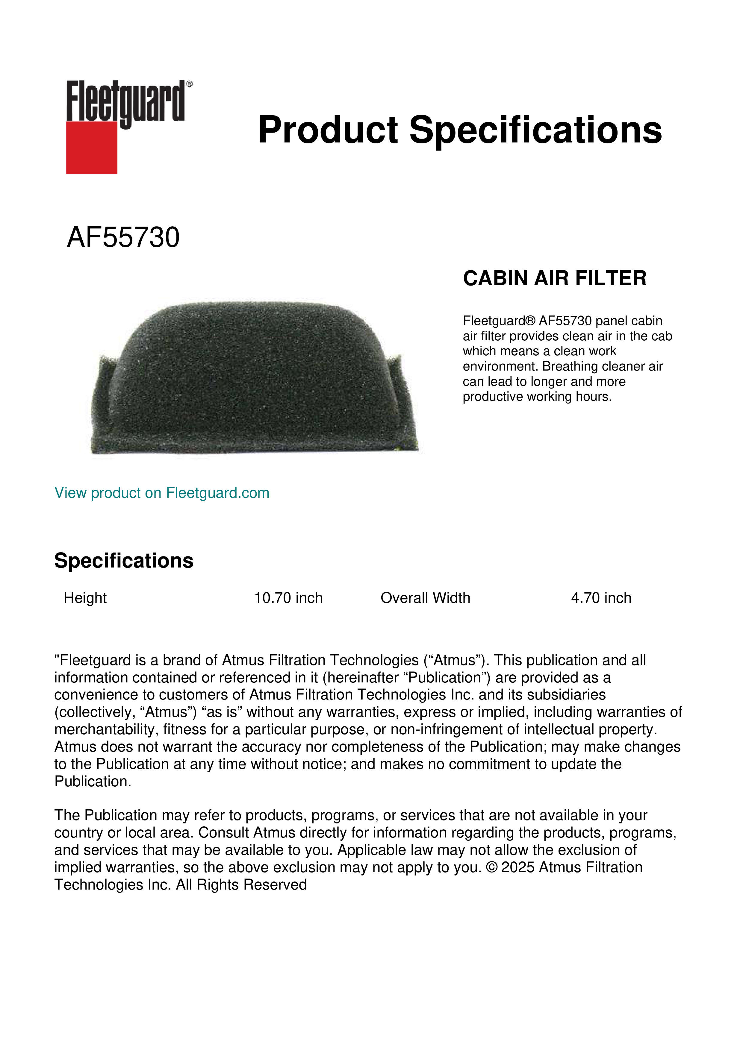 Fleetguard® AF55730 panel cabin air filter provides clean air in the cab which means a clean work environment. Breathing cleaner air can lead to longer and more productive working hours.Specification